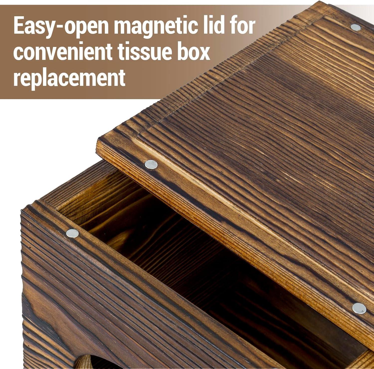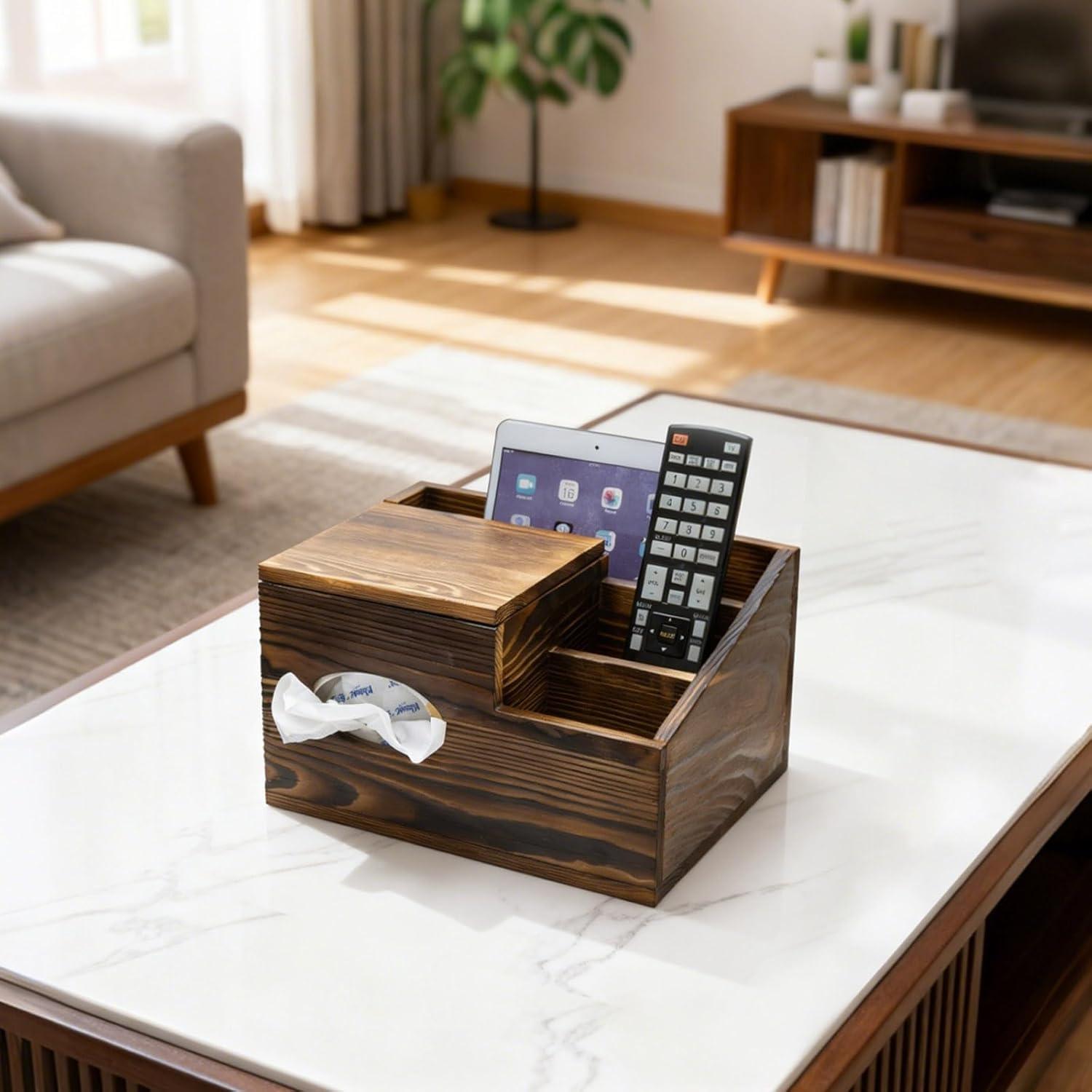 Add rustic charm and practical organization to your living space with the MyGift Deluxe Burnt Wood Remote Control Holder with Tissue Box Cover. Designed for both function and style, this multipurpose tabletop organizer features a warm burnt wood finish and multiple compartments to keep your living room or bedroom essentials neatly arranged and within reach. The top includes a standard tissue box cover, offering a convenient and stylish way to store facial tissues, while the spacious compartments can hold everything from TV remotes and smartphones to tablets, notepads, and reading glasses. Its front slot is ideal for keeping your tablet or e-reader upright, while the side compartments accommodate remote controls or other small electronics. Whether placed on a coffee table, side table, or nightstand, this all-in-one storage caddy keeps clutter at bay while blending seamlessly into rustic, farmhouse, or industrial décor themes. Perfect for daily use or gifting to someone who values style and convenience in home organization.