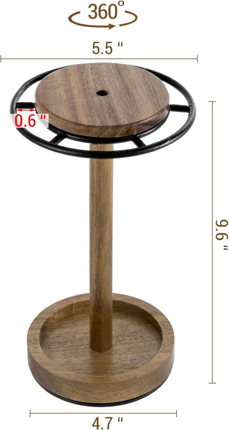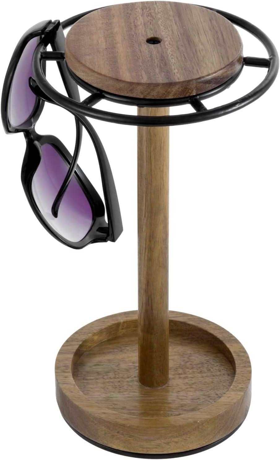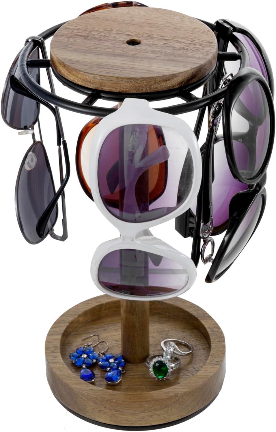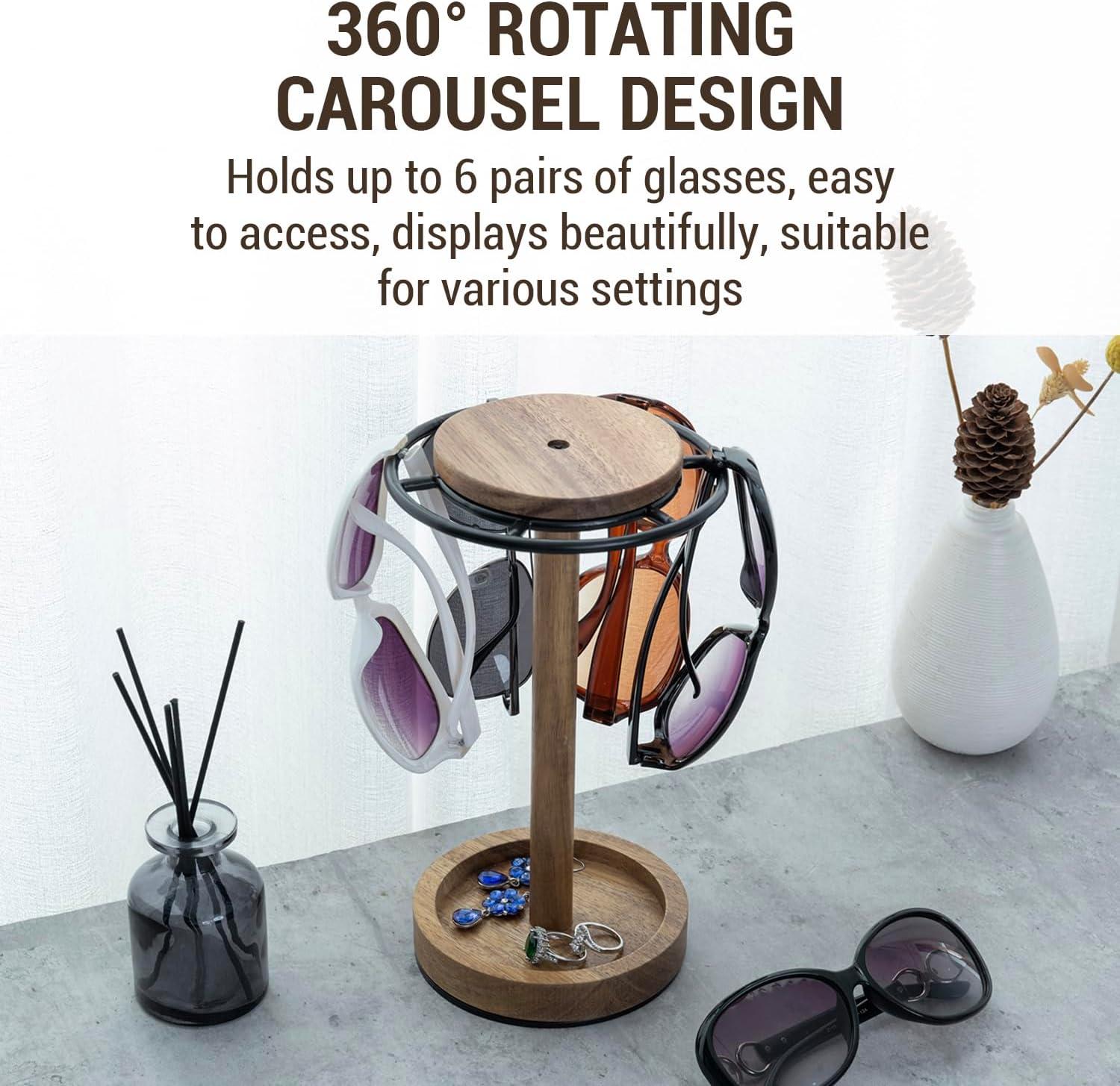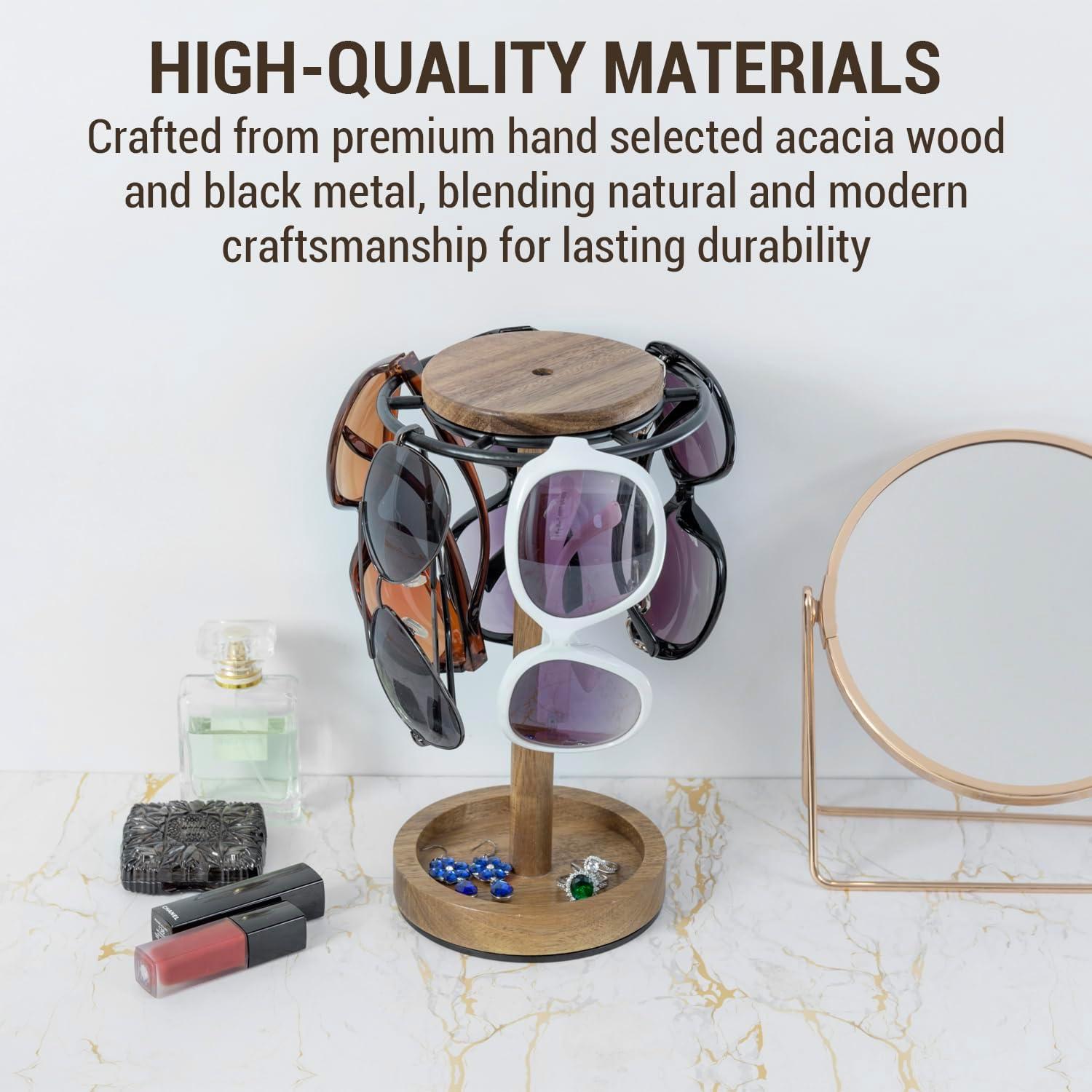 Premium acacia wood and black metal 360° rotating sunglasses stand displays modern rustic decor with practical function in any home or retail setting