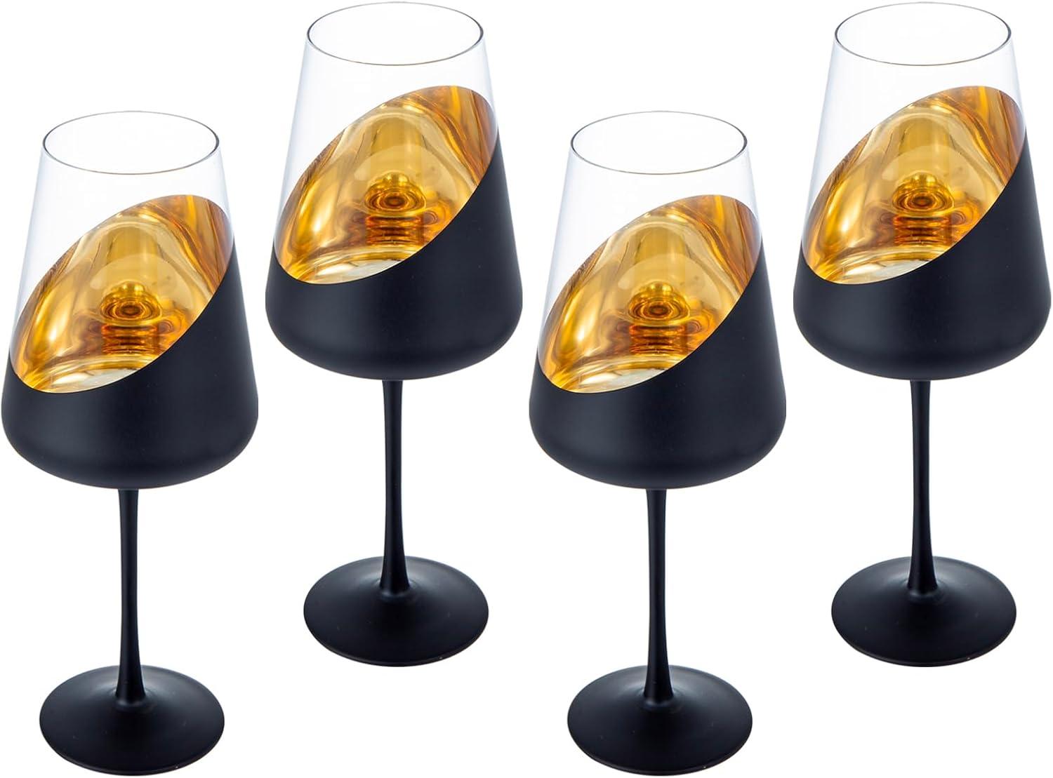 Elevate your entertaining experience with this set of 4 modern matte black and gold tulip-shaped wine glasses from MyGift. Each 19 oz glass combines sleek black exteriors with a luxurious gold-tone interior, creating a striking two-tone design that adds sophistication to any table setting. The elegant tulip-shaped bowl is designed to enhance the aroma and flavor of your favorite wines, cocktails, or sparkling beverages, while the sturdy stem allows for comfortable handling. Perfect for dinner parties, special occasions, or casual entertaining, these glasses bring a modern, stylish flair to any event. Durable and reusable, this wine glass set not only functions as practical drinkware but also doubles as a decorative accent, adding a touch of glamour to your home bar or dining table. Whether used for wine, cocktails, or creative beverages, these glasses combine functionality, elegance, and contemporary style.